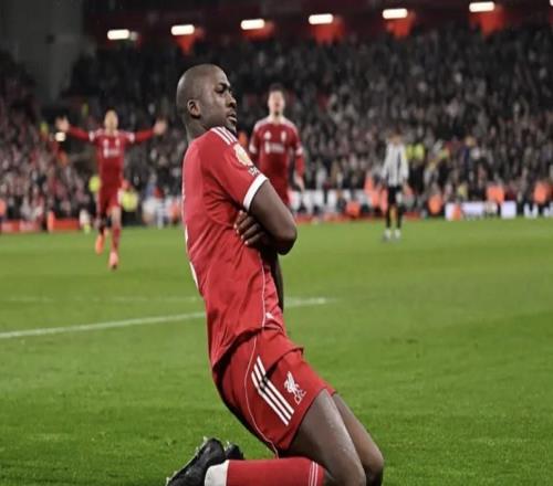 动容!利物浦1米94黑塔进球告慰亡父,跪滑+热泪盈眶,全队送拥抱
